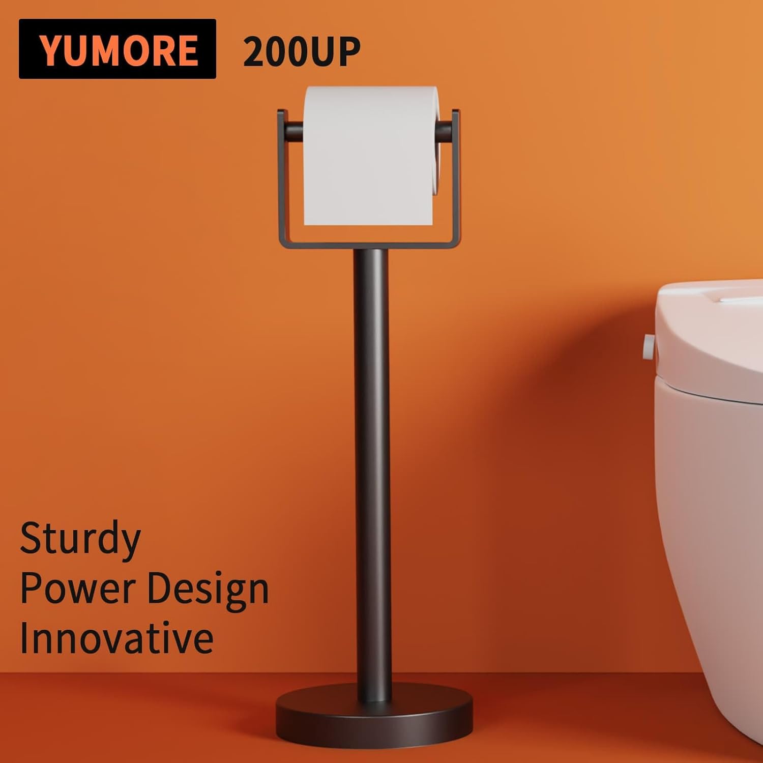 YUMORE Toilet Paper Holder Free Standing, Stainless Steel Toilet Paper Stand, Weighted Base Floor Tissue Roll Holder for Bathroom, Matte Black 200UP